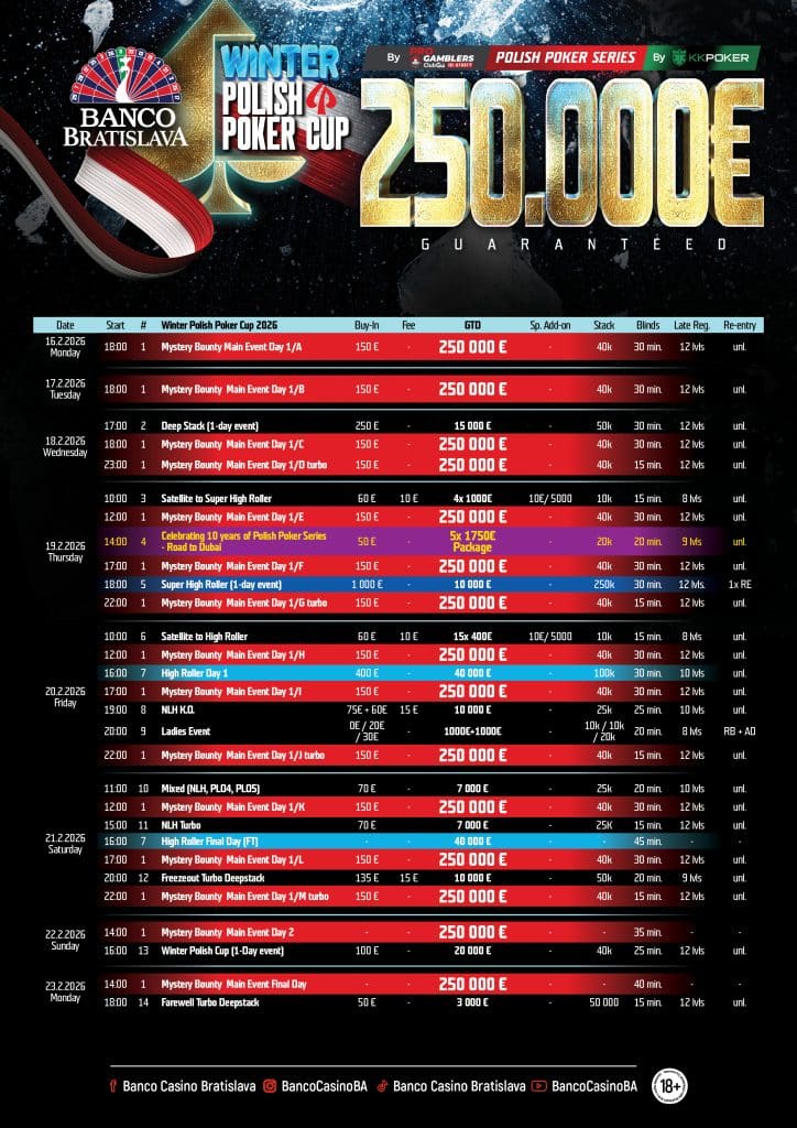 Partiamo con la Winter Polish Poker Cup, che torna di scena al Banco Casino di Bratislava. Si giocherà dal 16 al 23 febbraio, per una lunga settimana all’insegna del grande poker. L’appuntamento più atteso di questo evento sarà il Mystery Bounty Main Event, anche perchè ci sono tante condizioni a dir poco favorevoli. A partire dal buy-in da appena 150 euro, che senza dubbio rende il torneo molto appetibile. Per non parlare del montepremi garantito da 250.000 euro. Naturalmente ci vorrà molta pazienza e un grande mindset per arrivare fino in fondo, anche perchè i Day 1 in programma sono ben undici, tra cui il Day 1M in modalità Turbo.