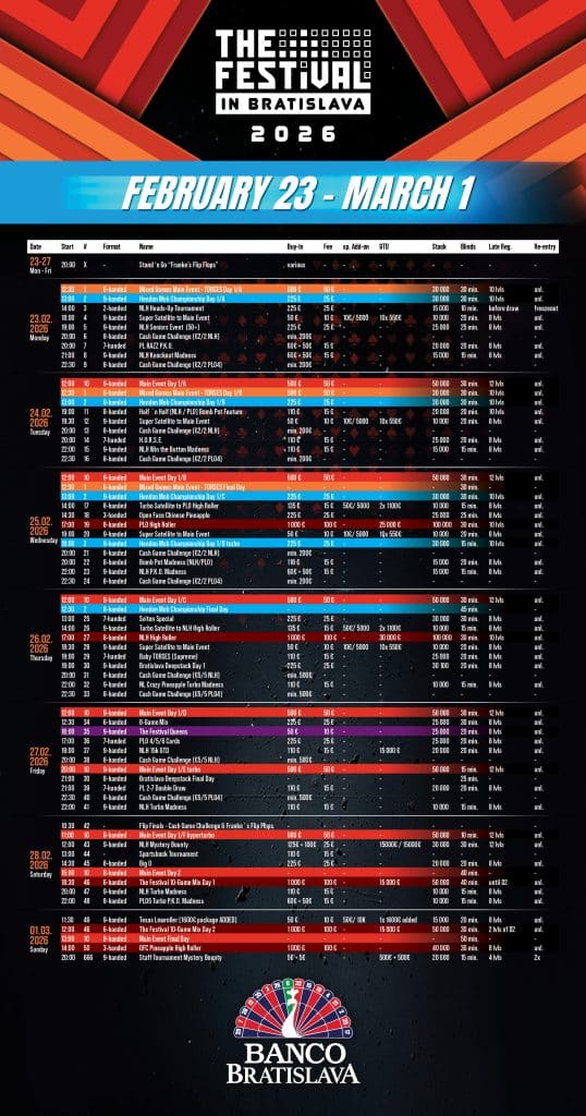 Il mese di febbraio si prospetta a dir poco molto interessante per gli aficionados del Banco Casino di Bratislava. Se – come abbiamo avuto modo di vedere – a gennaio ci sono stati tanti appuntamenti di grande spessore e con una presenza molto folta di giocatori, a seguire ci saranno altri due eventi che non possono essere persi. Stiamo parlando dell’edizione invernale della Polish Poker Cup e di una nuova tappa del The Festival. Due circuiti di grandissimo livello, per i quali si prospetta anche in questo caso il “sold out” ai tavoli della casa da gioco della capitale della Slovacchia.